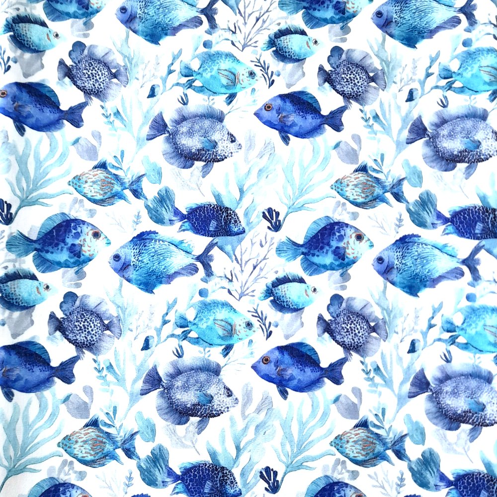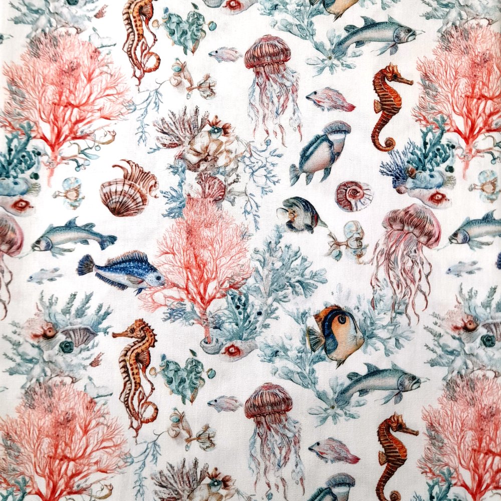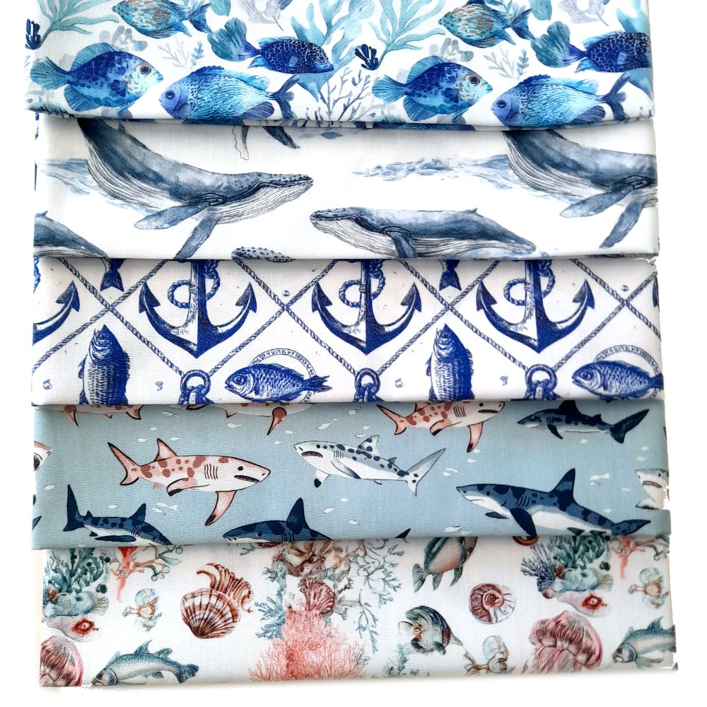 The "Ocean Creatures" fat quarter bundle. This fabric bundle includes 5 great fat quarters of 100% cotton high quality fabric in the designs as shown. The bundle has an ocean / sea life theme with colours of blue, turquoise & coral.
